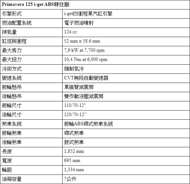Vespa Primavera S特仕版搭載了12吋鋁合金五幅輪圈,提供車輛較佳的穩定性與安全性,並確保即使在不同路況的道路騎乘時,依然有良好的抓地力,並配備LED頭尾燈與日行燈、晶片防盜系統、與前輪ABS碟式煞車系統,給車主安心的騎乘標準。